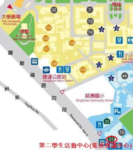(2)搭乘捷運新店線於公館站下車,步行校園約15-20分鐘