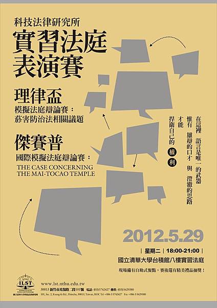 不用到台北、不用到歐洲,讓清大科法所帶領你進入法律的殿堂,感受那過 程緊張刺激但結局歡樂無比的法庭表演賽!!
