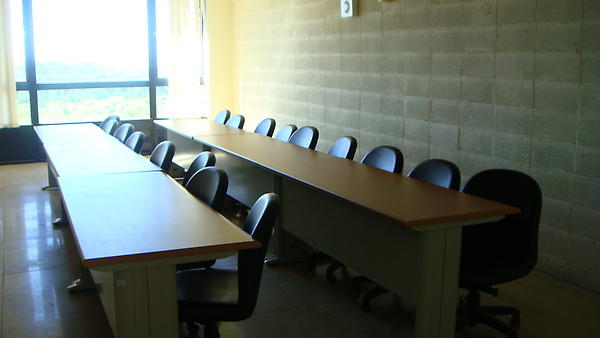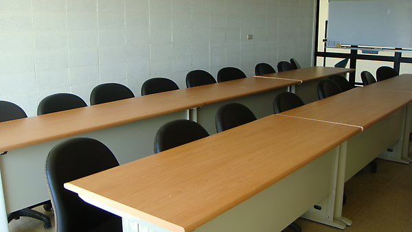 這三間教室平常供研究生上課用,桌子前是黑板和升降的螢幕。